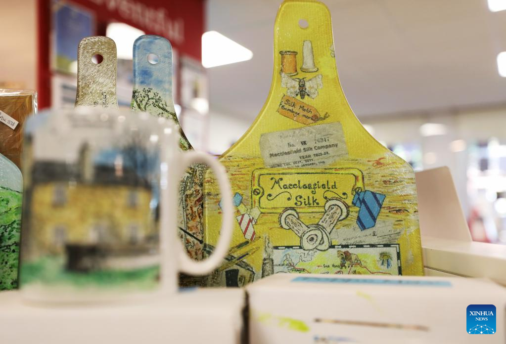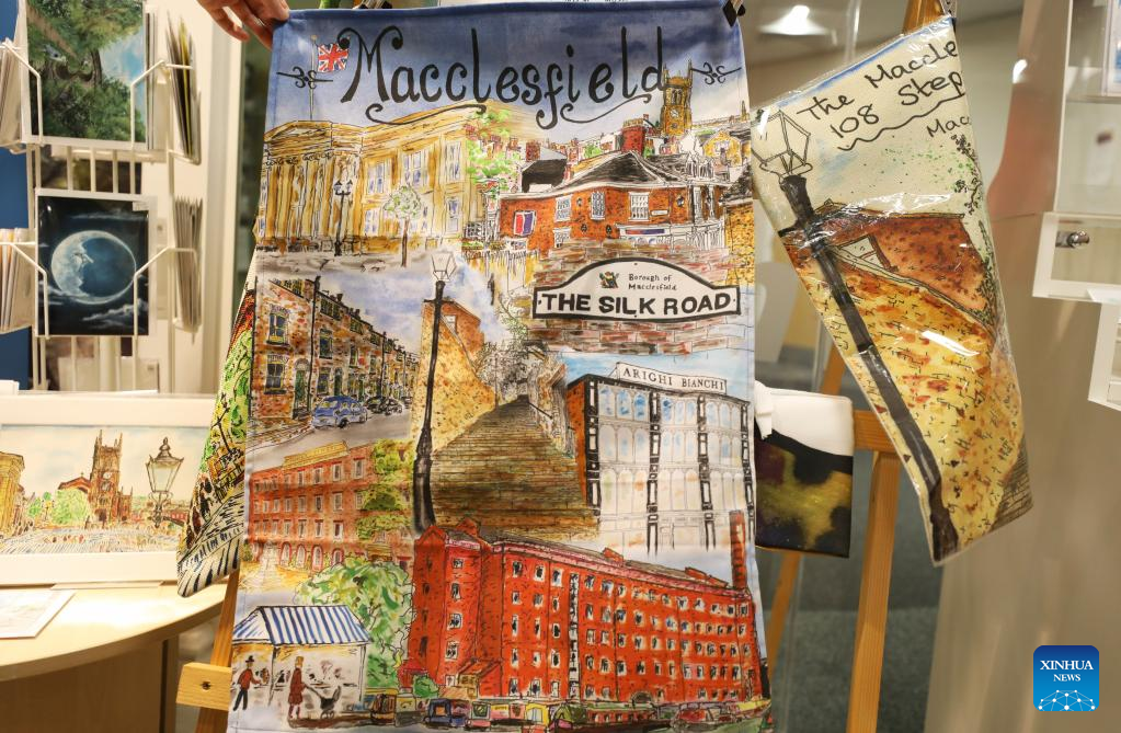 Photo taken on Aug. 12, 2022 shows souvenirs in a shop in Macclesfield, Britain. The town of Macclesfield in northwest England was dubbed the "silk capital of England" in the 18th century, and now local entrepreneurs and artists are trying to keep this heritage alive. (Xinhua/Li Ying)
