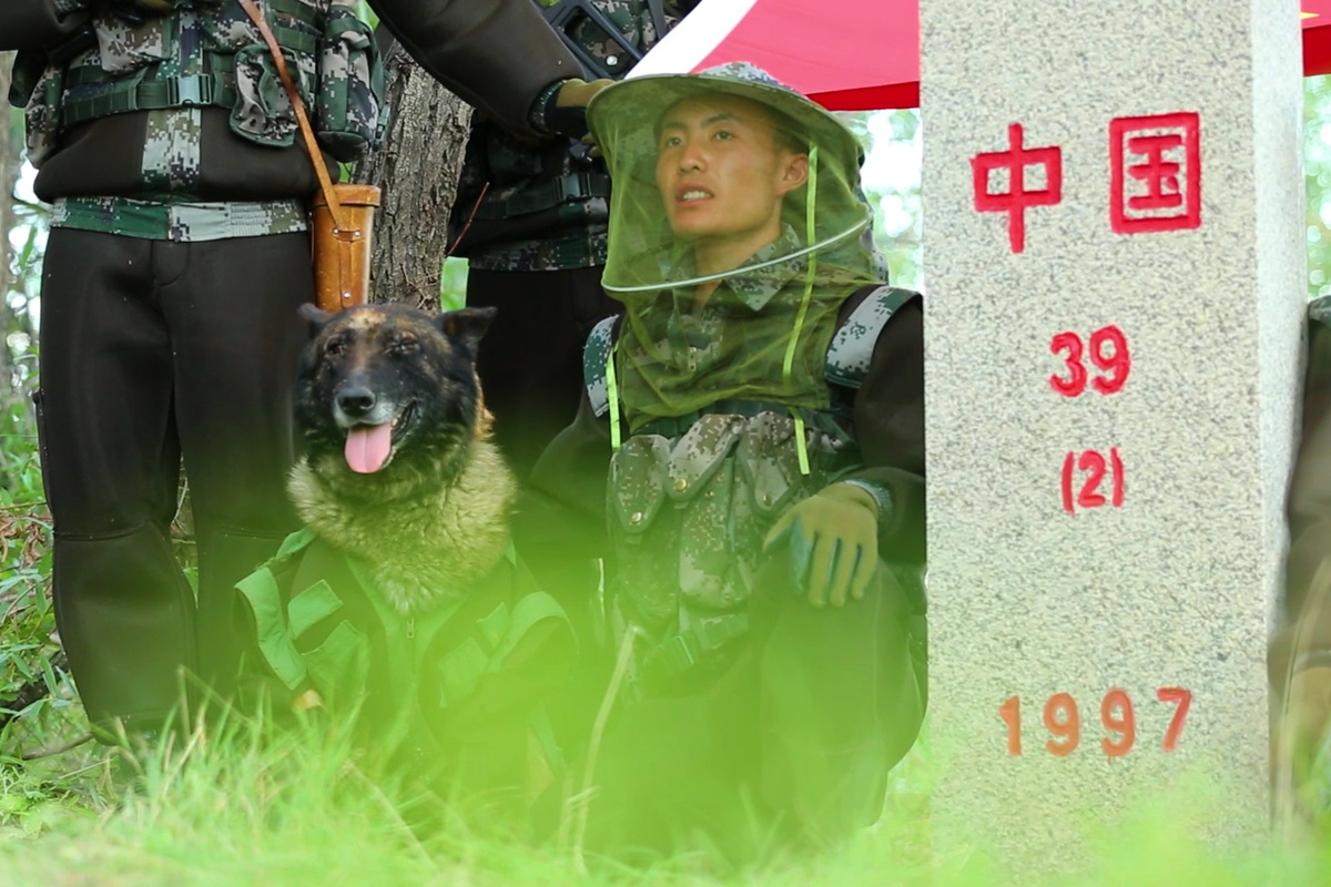 Yanlong, a military dog, takes a photo together with border soldiers at a China and Kazakhstan border marker in Altay prefecture in the Xinjiang Uygur autonomous region. [Photo provided to chinadaily.com.cn]