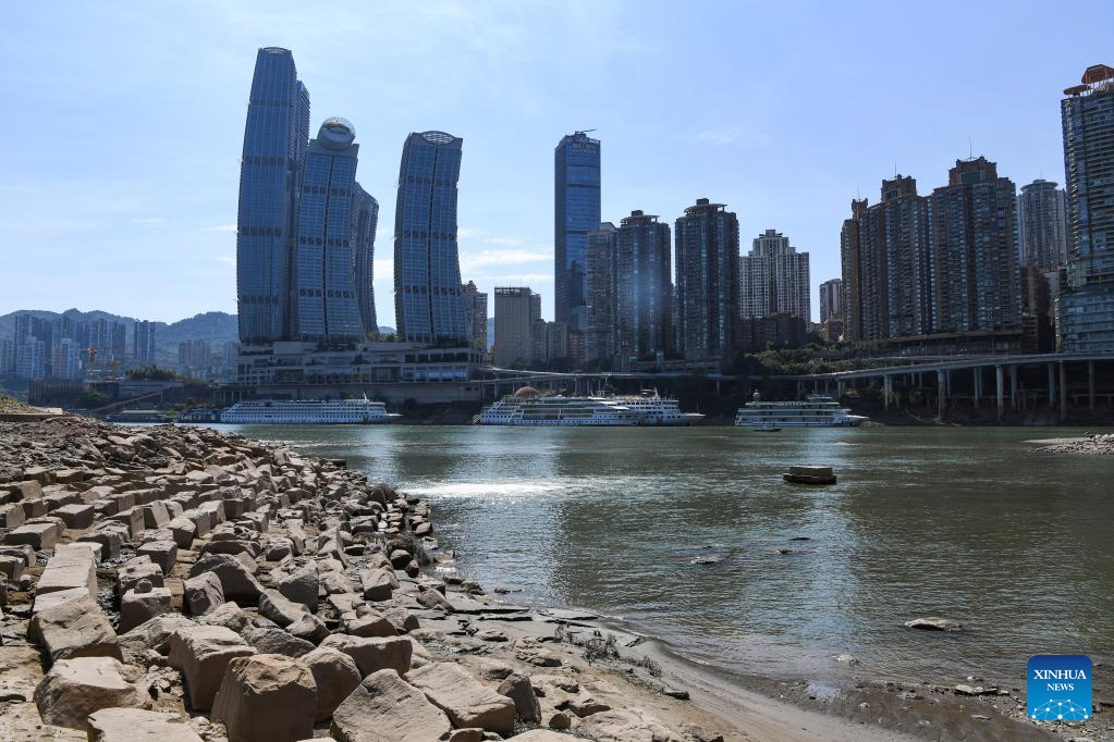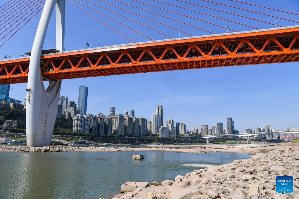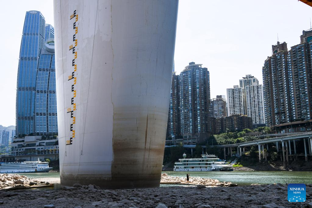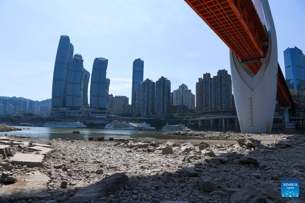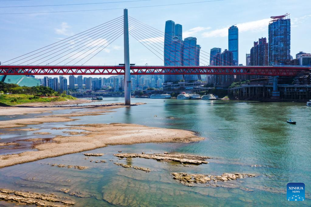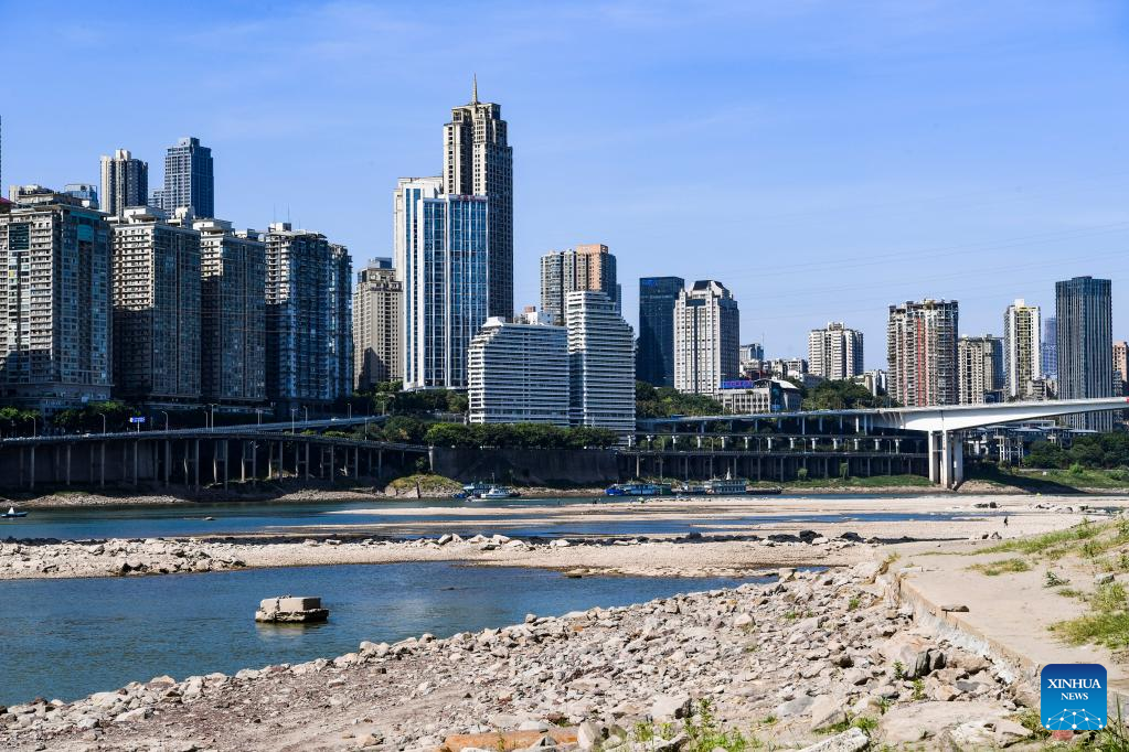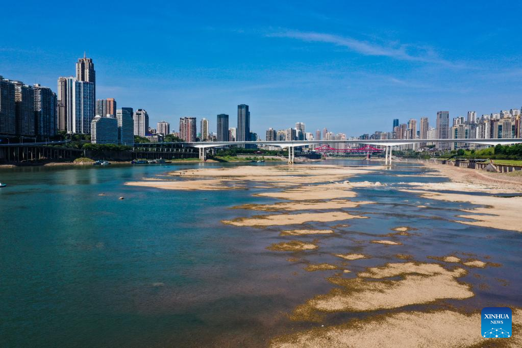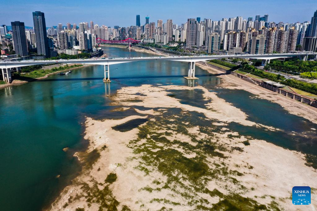 Due to the decrease of upstream water, continuous high temperature and less rainfall, the water level of Jialing River flowing through the main urban area of Chongqing has fallen significantly. (Xinhua/Wang Quanchao)