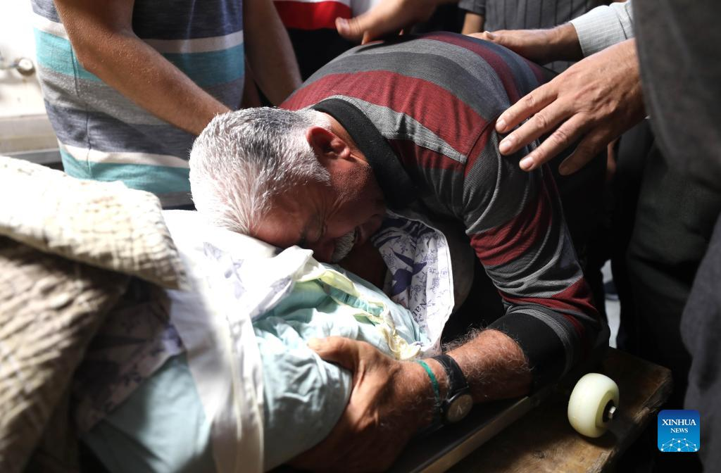 A relative of Palestinian Salah Sawafta mourns over his body at a hospital in the West Bank city of Nablus, Aug. 19, 2022. Salah Sawafta, 58, died from critical injuries after being shot in the head by Israeli soldiers in the West Bank city of Tubas, the Palestinian health ministry said. (Photo by Ayman Nobani/Xinhua)