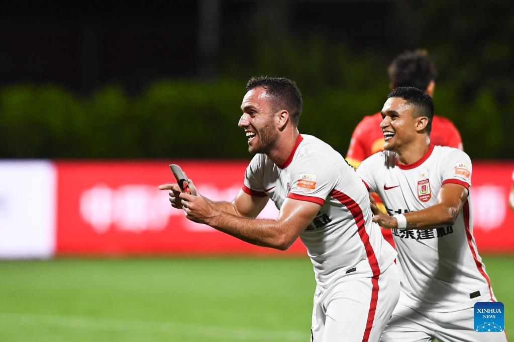 Serginho (L) of Changchun Yatai celebrates for a goal, which is called off for offside afterwards during a 2022 season Chinese Football Association Super League (CSL) match between Hebei FC and Changchun Yatai in Haikou, south China's Hainan Province, Aug. 19, 2022. (Xinhua/Hu Zhixuan)