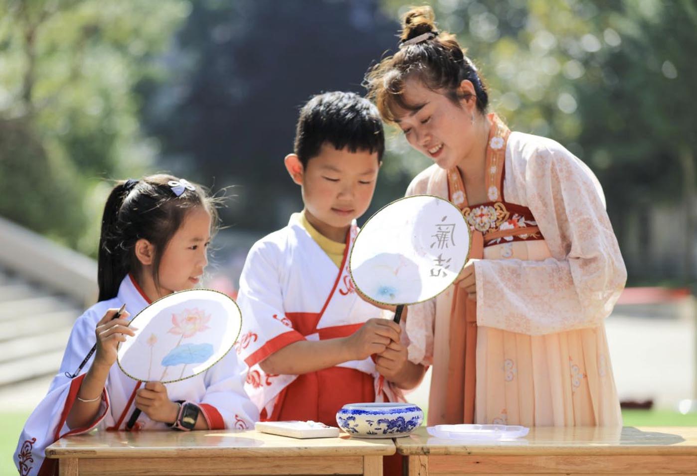 A teacher (right) wearing Hanfu, the traditional clothing of the Han ethnic group, instructs students to make Chinese moon-shaped fans in a primary school in Guanyindong township, Qianxi, southwest China's Guizhou province, July 6, 2022. (Photo by Zhou Xunchao/People's Daily Online)