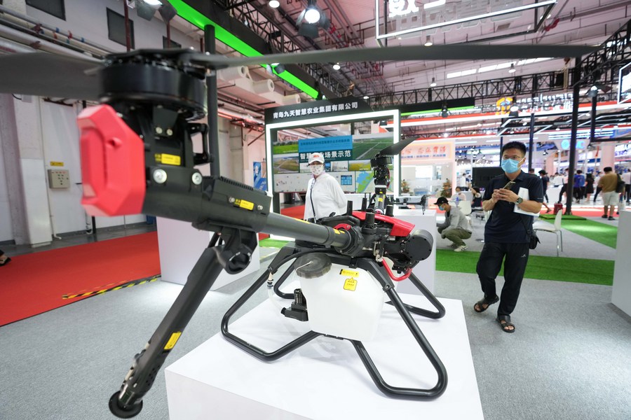 An agricultural drone is on display at the World Robot Conference 2022 (WRC 2022) in Beijing, capital of China, Aug. 19, 2022. (Xinhua/Ju Huanzong)