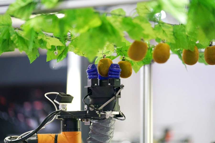 A fruit-picking robot is on display at the World Robot Conference 2022 (WRC 2022) in Beijing, capital of China, Aug. 18, 2022. (Xinhua/Ju Huanzong)