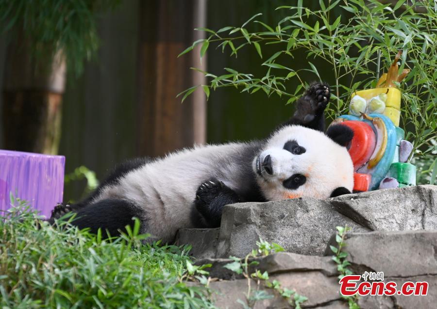 Giant panda "Xiao Qi Ji" enjoys its birthday cake at Smithsonian's National Zoo in Washington, D.C., U.S., Aug. 21, 2022. (Photo: China News Service/Chen Mengtong)