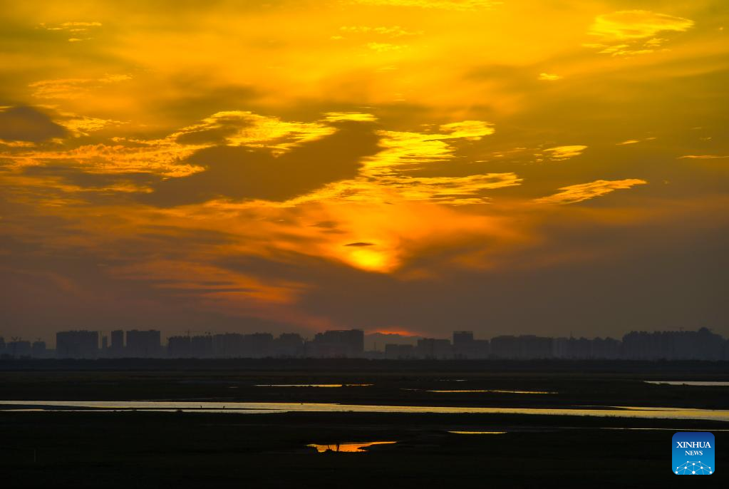 Photo taken on Aug. 16, 2022 shows the sunset above the Yellow River in Dalad Banner in Erdos, north China's Inner Mongolia Autonomous Region. (Xinhua/Peng Yuan)