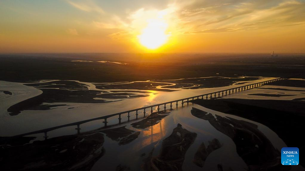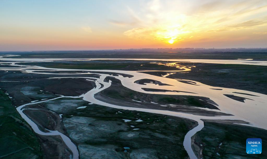 Aerial photo taken on Aug. 16, 2022 shows the sunset above the Yellow River in Hanggin Banner in Erdos, north China's Inner Mongolia Autonomous Region. (Xinhua/Peng Yuan)