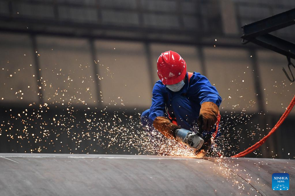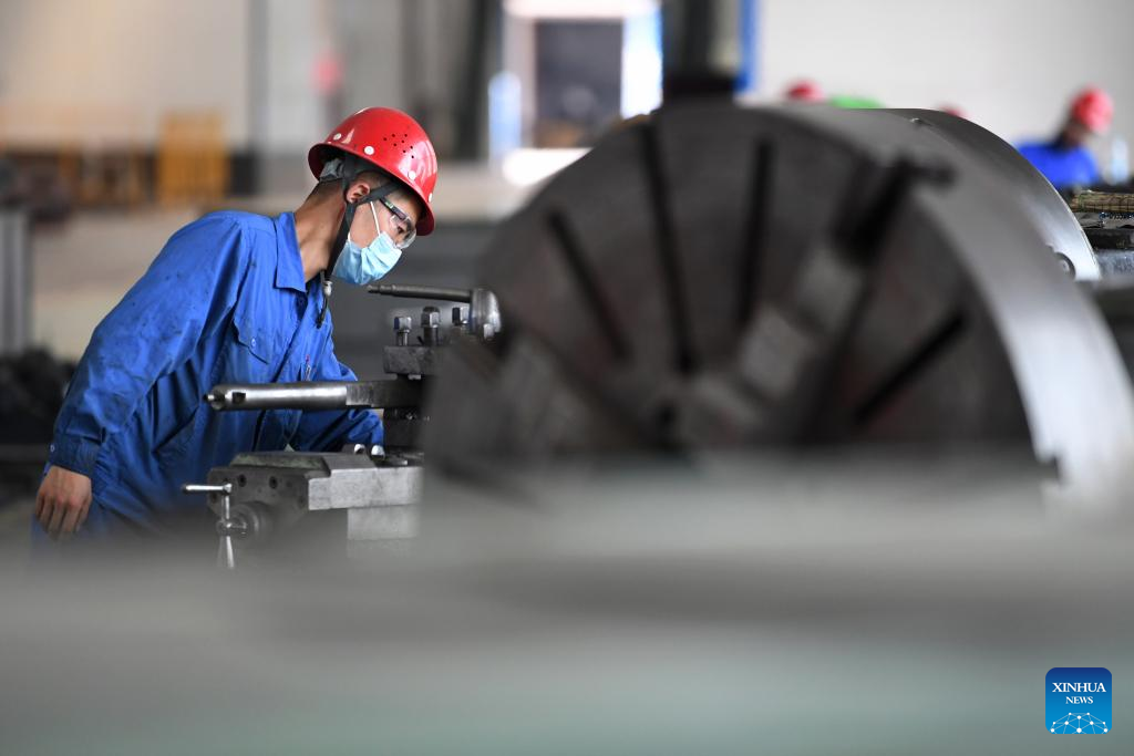 An employee works in a workshop of LS Group High Tech Equipment Industrial Park in Lanzhou New Area in Lanzhou, northwest China's Gansu Province, Aug. 11, 2022.
