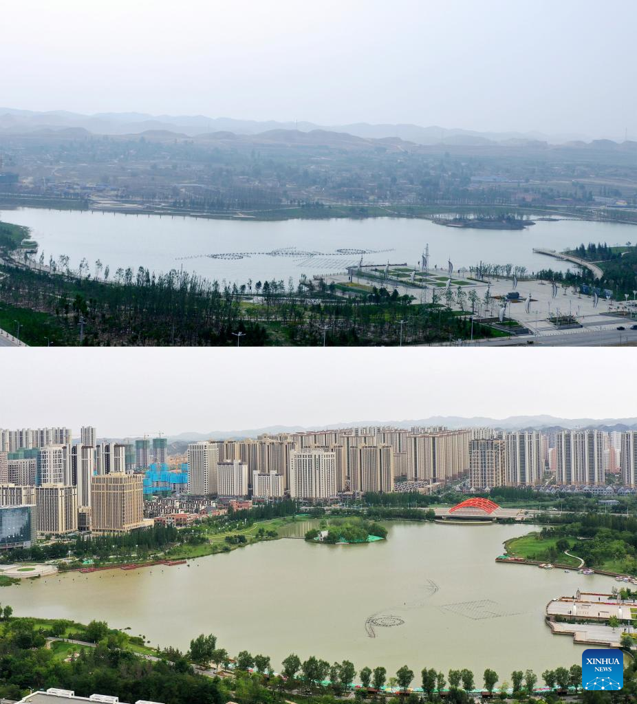 Combo photo shows a view of Qixia Lake on Aug. 22, 2013 (top, photo provided by Lanzhou New Area), and Qixia Lake on Aug. 10, 2022 (aerial photo taken by Chen Bin), in Lanzhou New Area in Lanzhou, northwest China's Gansu Province.