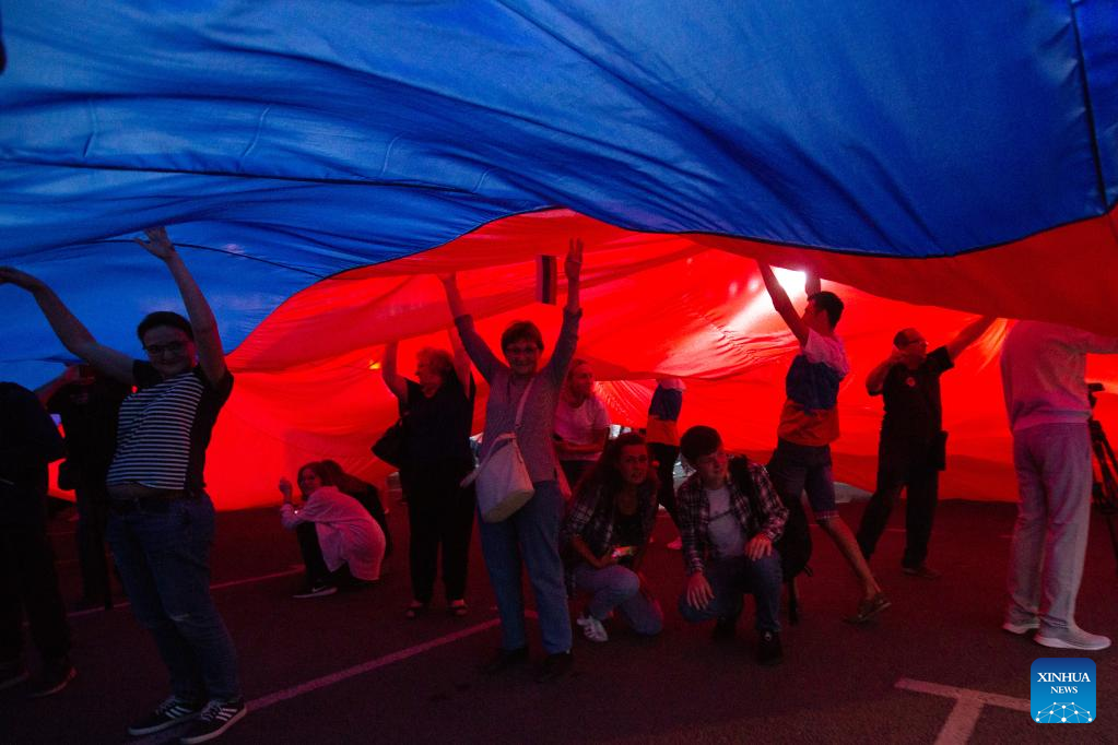 People participate in the National Flag Day celebrations in St. Petersburg, Russia, Aug. 22, 2022. (Photo by Irina Motina/Xinhua)
