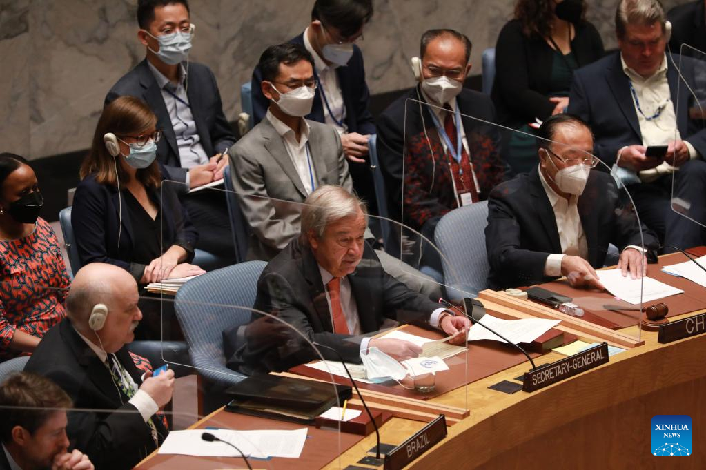 UN Secretary-General Antonio Guterres (C, Front) speaks at a Security Council briefing on promoting common security through dialogue and cooperation at the UN headquarters in New York, on Aug. 22, 2022. Guterres on Monday stressed the need to reforge a global consensus around the cooperation required to ensure collective security. (Xinhua/Xie E)