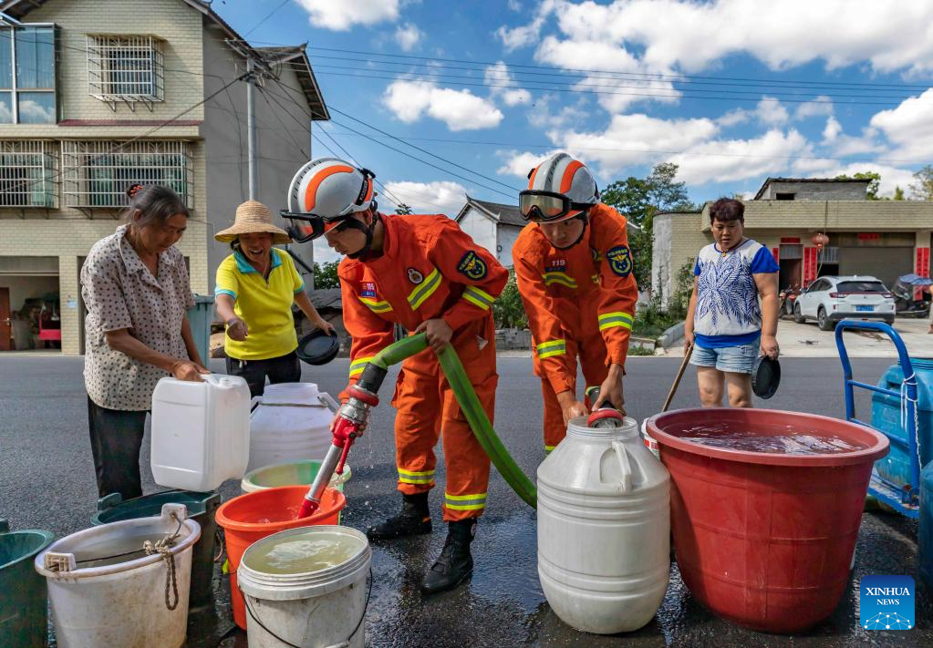 Fire fighters deliver water to residents in Xingqian community of Qianxi City, southwest China's Guizhou Province, Aug. 22, 2022. (Photo by Fan Hui/Xinhua)