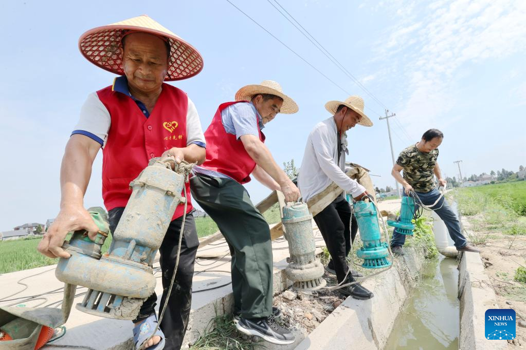 Farmers pump water into their rice field in Jiangdu District, Yangzhou City of east China's Jiangsu Province, Aug. 23, 2022. (Photo by Meng Delong/Xinhua)