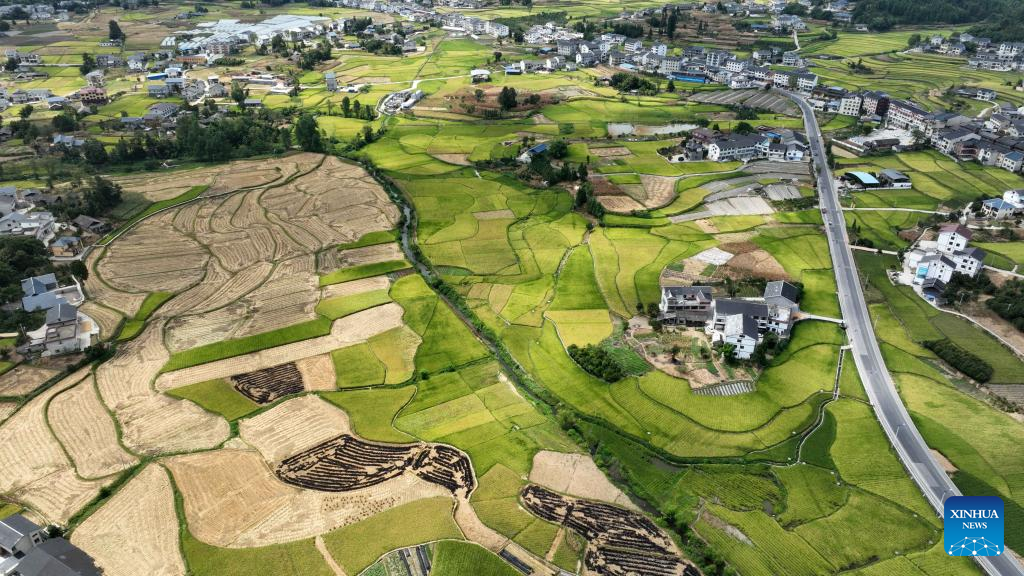 Aerial photo taken on Aug. 23, 2022 shows a view of the rice fields in Wangcao Township, Suiyang County of southwest China's Guizhou Province. (Xinhua/Yang Ying)