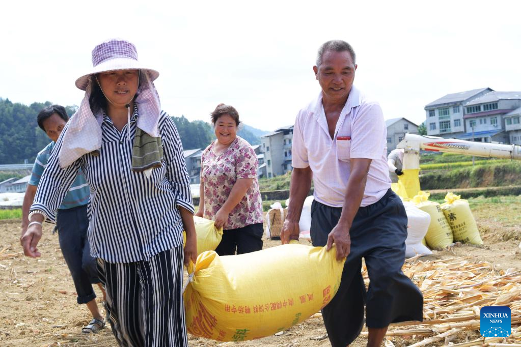 Farmers move packs of rice in Wangcao Township, Suiyang County of southwest China's Guizhou Province, Aug. 23, 2022. (Xinhua/Yang Ying)