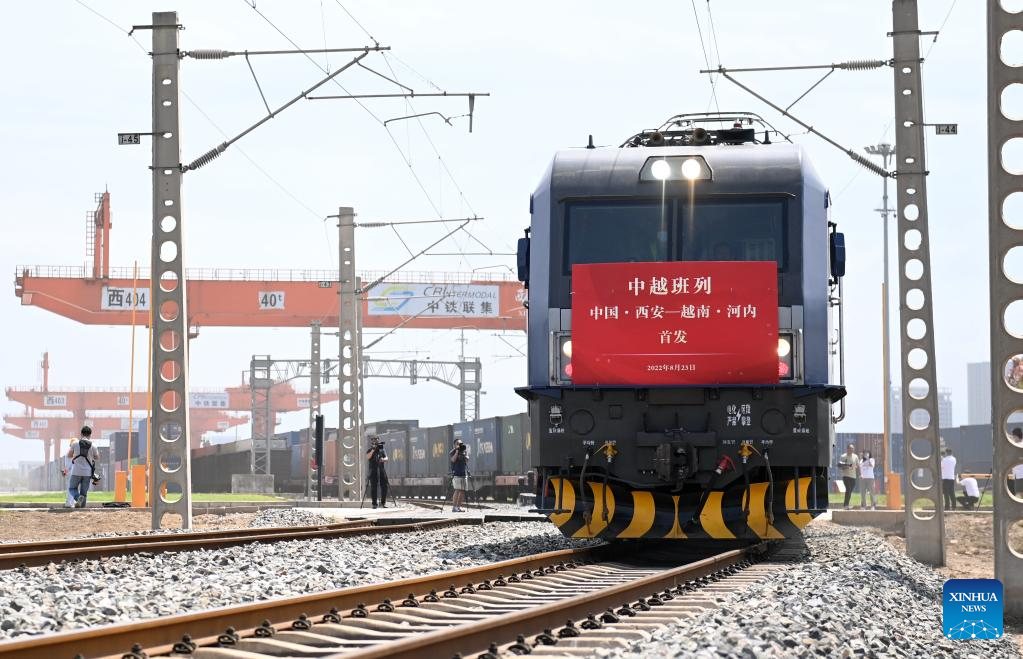 A China-Vietnam freight train pulls out of Xi'an international port in Xi'an, northwest China's Shaanxi Province, Aug. 23, 2022. The freight train left the Xi'an international port in Shaanxi Province on Tuesday for Vietnam's Hanoi, marking the first China-Vietnam freight train route connecting Shaanxi and Vietnam.