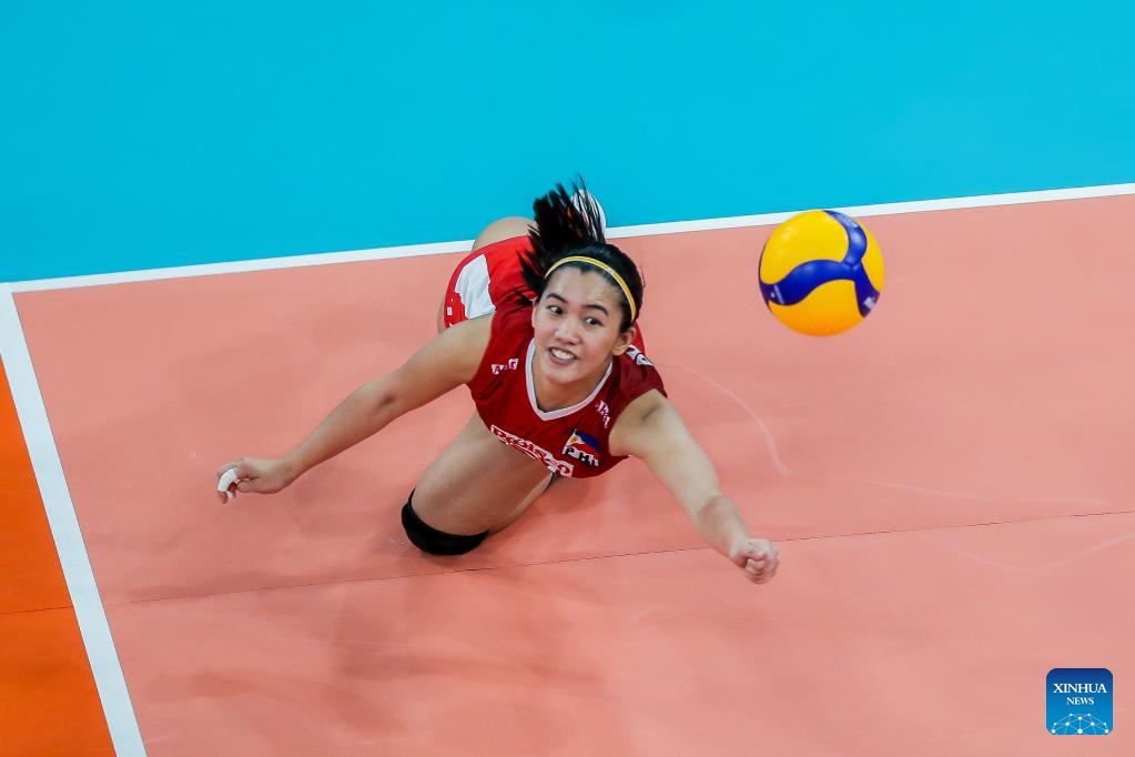 Panaga Jeanette of the Philippines saves the ball during the preliminary round match between China and the Philippines at the 2022 AVC Cup for women at the Philsports Arena in Pasig City, the Philippines, Aug. 23, 2022. (Xinhua/Rouelle Umali)