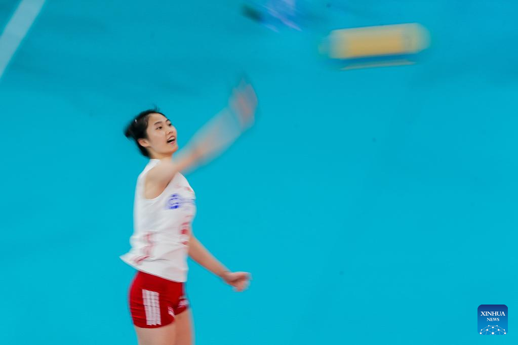 Wang Yifan of China serves the ball during the preliminary round match between China and the Philippines at the 2022 AVC Cup for women at the Philsports Arena in Pasig City, the Philippines, Aug. 23, 2022. (Xinhua/Rouelle Umali)