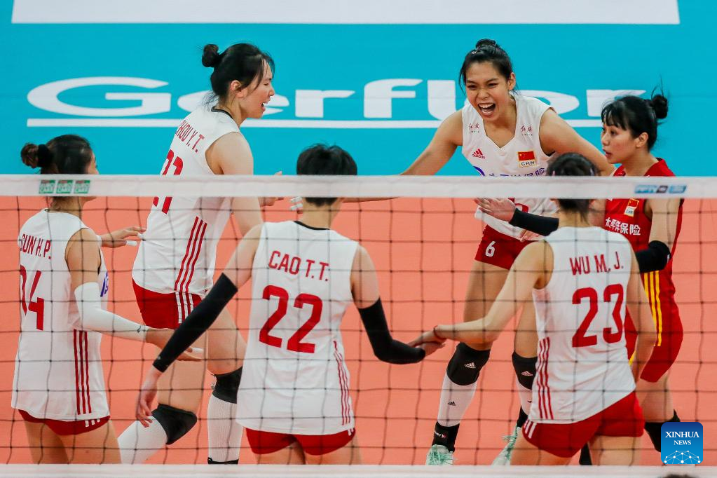 Players of China celebrate scoring during the preliminary round match between China and the Philippines at the 2022 AVC Cup for women at the Philsports Arena in Pasig City, the Philippines, Aug. 23, 2022. (Xinhua/Rouelle Umali)