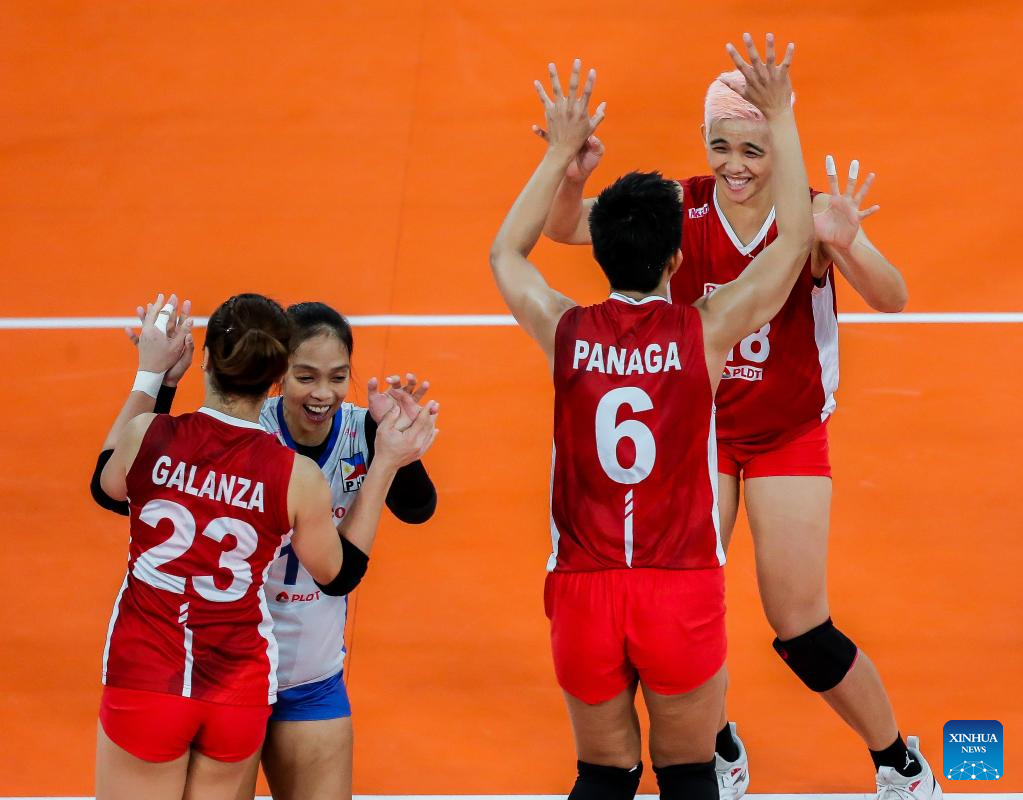 Pleyers of the Philippines celebrate scoring during the preliminary round match between China and the Philippines at the 2022 AVC Cup for women at the Philsports Arena in Pasig City, the Philippines, Aug. 23, 2022. (Xinhua/Rouelle Umali)