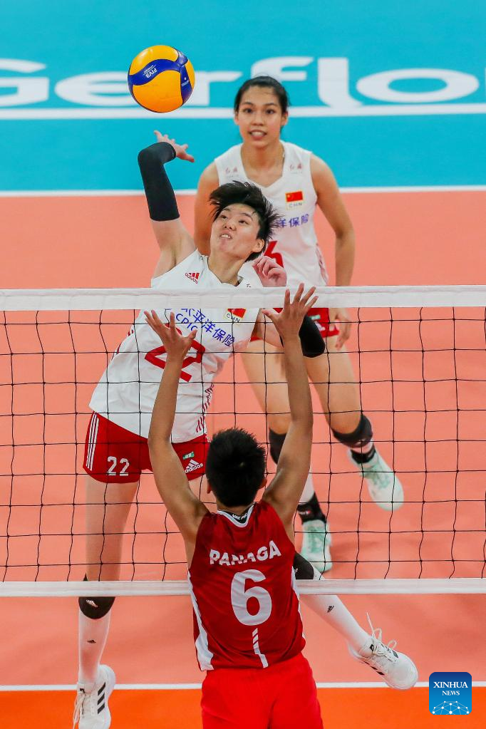 Wu Mengjie (1st R) of China spikes the ball during the preliminary round match between China and the Philippines at the 2022 AVC Cup for women at the Philsports Arena in Pasig City, the Philippines, Aug. 23, 2022. (Xinhua/Rouelle Umali)