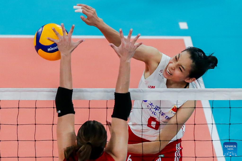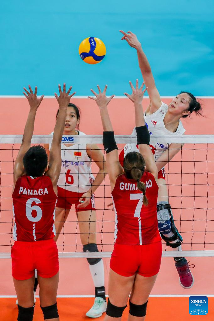 Zhuang Yushan (Top) of China spikes the ball during the preliminary round match between China and the Philippines at the 2022 AVC Cup for women at the Philsports Arena in Pasig City, the Philippines, Aug. 23, 2022. (Xinhua/Rouelle Umali)