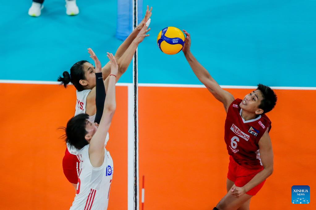 Panaga Jeanette (R) of the Philippines spikes the ball during the preliminary round match between China and the Philippines at the 2022 AVC Cup for women at the Philsports Arena in Pasig City, the Philippines, Aug. 23, 2022. (Xinhua/Rouelle Umali)