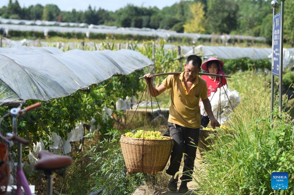 Villagers harvest grapes at a vineyard in Maozhushan Village of Caiwan Township in Quanzhou County, south China's Guangxi Zhuang Autonomous Region, Aug. 23, 2022. More than 2,000 mu (133 hectares) of grape fields entered the harvest season here recently. (Xinhua/Lu Boan)