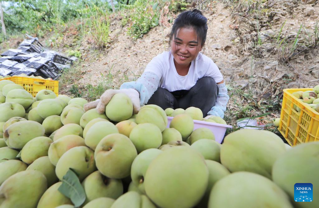 Villagers sort peaches in Xiazhai Village of Cengong County, Qiandongnan Miao and Dong Autonomous Prefecture, southwest China's Guizhou Province, Aug. 22, 2022. Tuesday marks the Chushu of the solar terms. The scorching summer is going to pass by after this day. (Photo by Luo Hui/Xinhua)