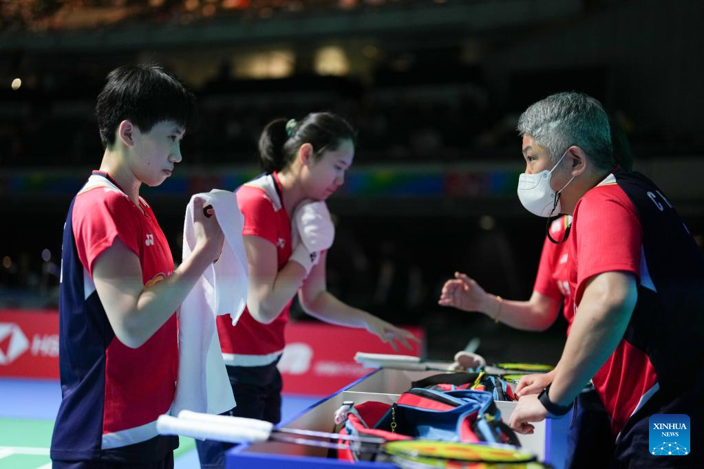 Kang Kyung-jin (R), coach of China, gives instructions to players Zhang Shuxian (L) /Zheng Yu during their women's doubles second round match against Julie Macpherson/Ciara Torrance of Scotland at the BWF World Championships 2022 in Tokyo, Japan, Aug. 24, 2022. (Xinhua/Zhang Xiaoyu)
