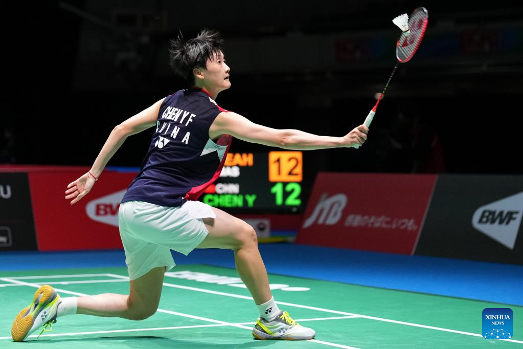 Chen Yufei of China competes during the women's singles second round match against Soniia Cheah of Malaysia at the BWF World Championships 2022 in Tokyo, Japan, Aug. 24, 2022. (Xinhua/Zhang Xiaoyu)
