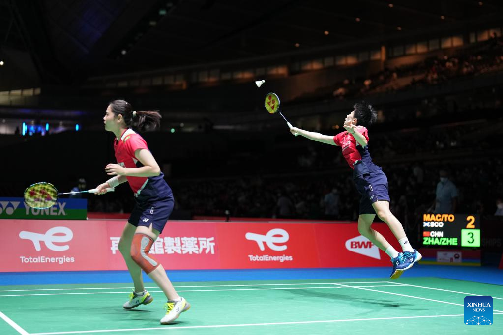 Zhang Shuxian/Zheng Yu (R) of China compete during the women's doubles second round match against Julie Macpherson/Ciara Torrance of Scotland at the BWF World Championships 2022 in Tokyo, Japan, Aug. 24, 2022. (Xinhua/Zhang Xiaoyu)