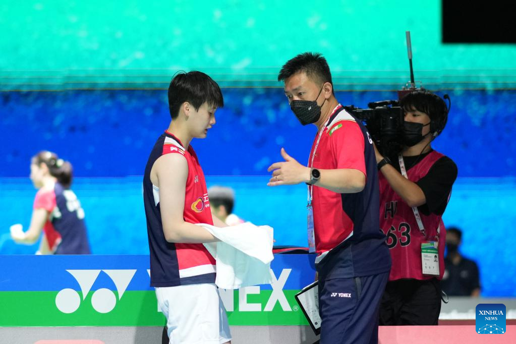 Chen Yufei (L) of China is instructed by her coach during the women's singles second round match against Soniia Cheah of Malaysia at the BWF World Championships 2022 in Tokyo, Japan, Aug. 24, 2022. (Xinhua/Zhang Xiaoyu)
