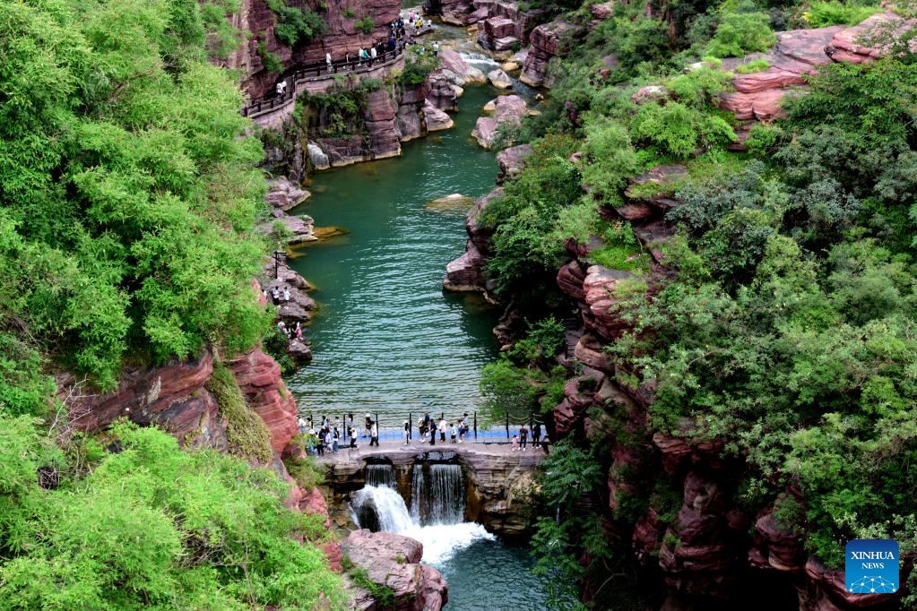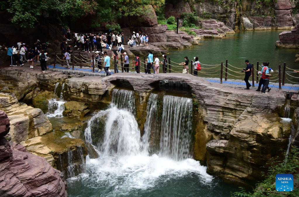 People visit the Yuntai Mountain scenic spot in central China's Henan Province, Aug. 24, 2022. (Xinhua/Lyu Guoqing)