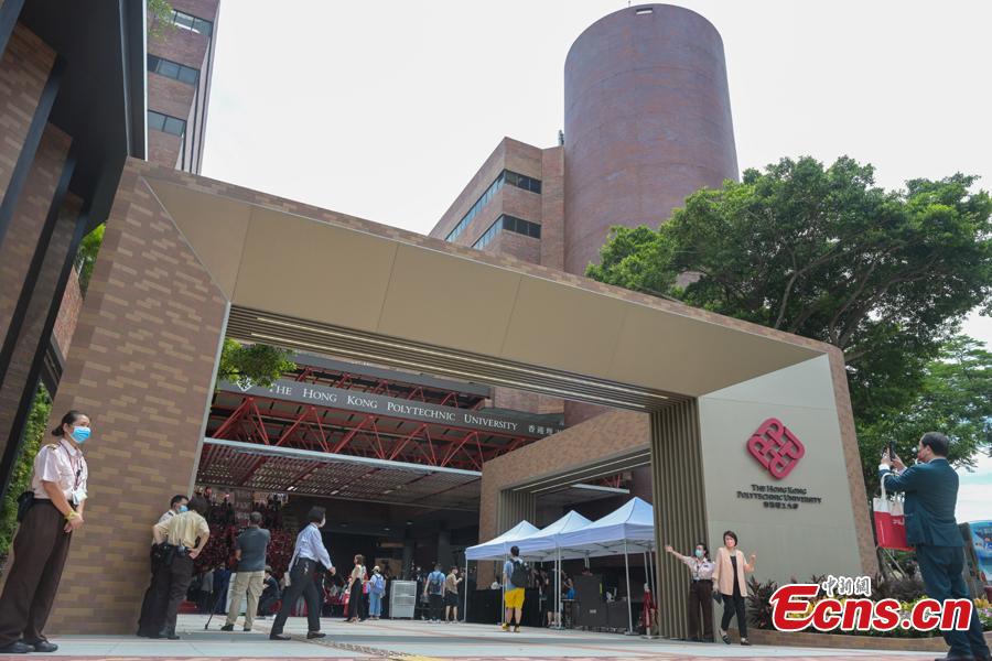 The Hong Kong Polytechnic University (PolyU) unveils its iconic main entrance near Core A on Cheong Wan Road, August 24, 2022. (Photo: China News Service)