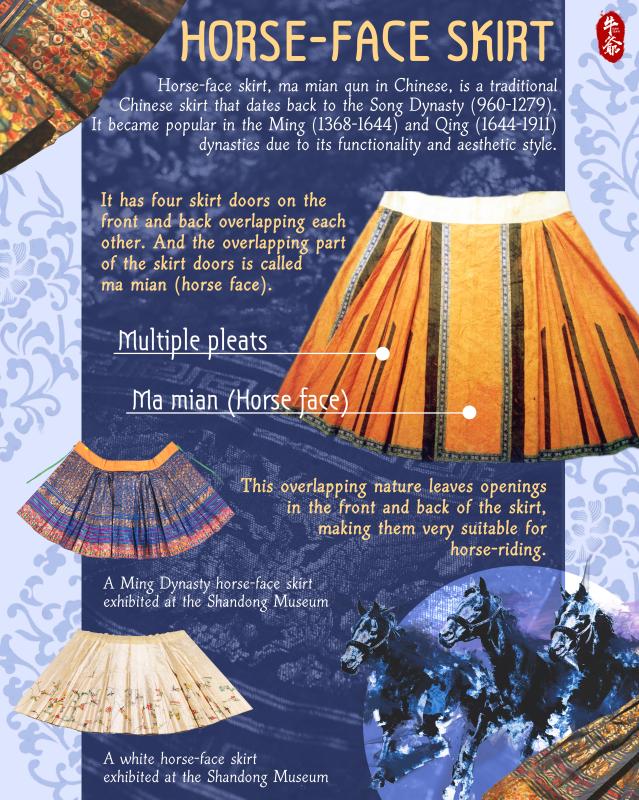 Horse-face skirt, ma mian qun in Chinese, is a traditional Chinese skirt that dates back to the Song Dynasty (960-1279). It became popular in the Ming (1368-1644) and Qing (1644-1911) dynasties due to its functionality and aesthetic style.