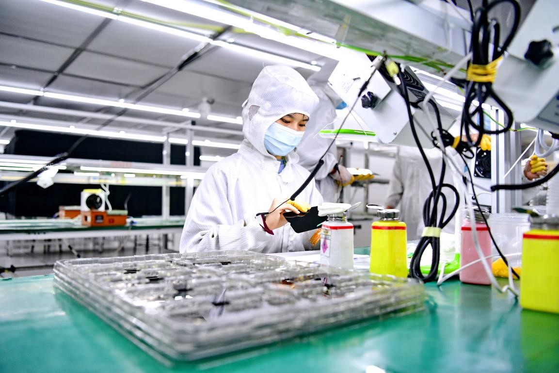 Workers produce screens of 5G mobile phones to be exported at a factory in Ganzhou, east China's Jiangxi province, May 13, 2022. (People's Daily Online/Zhu Haipeng)