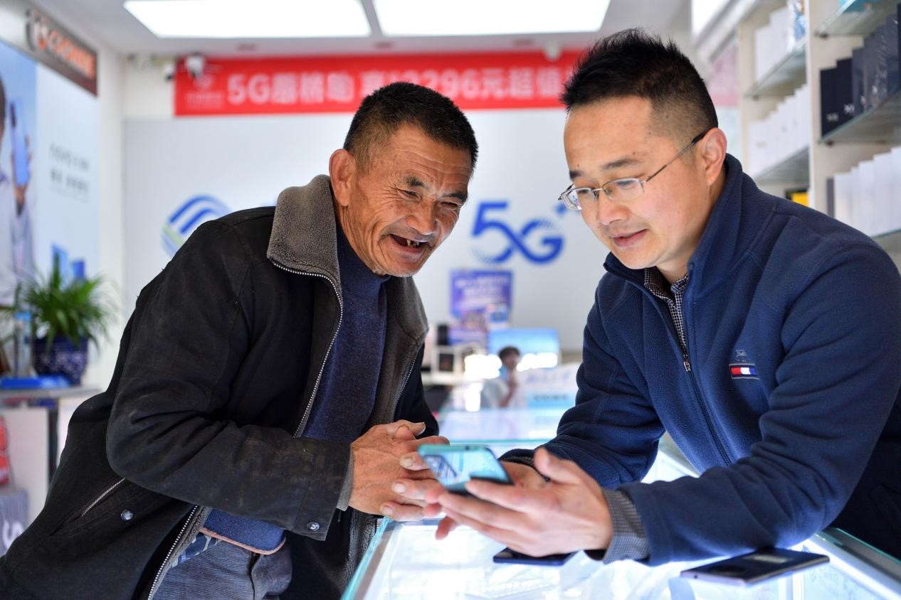 A man buys a 5G mobile phone at a shop in Maqiao township, Baokang county, Xiangyang, central China's Hubei province, Nov. 12, 2021. (People's Daily Online/Yang Tao)