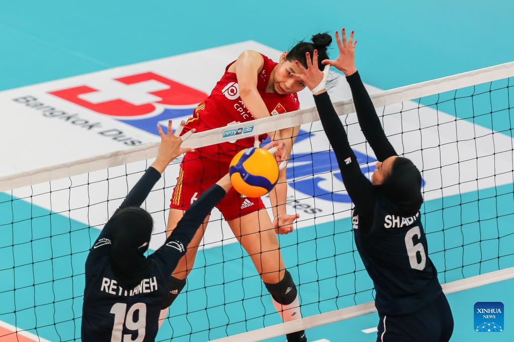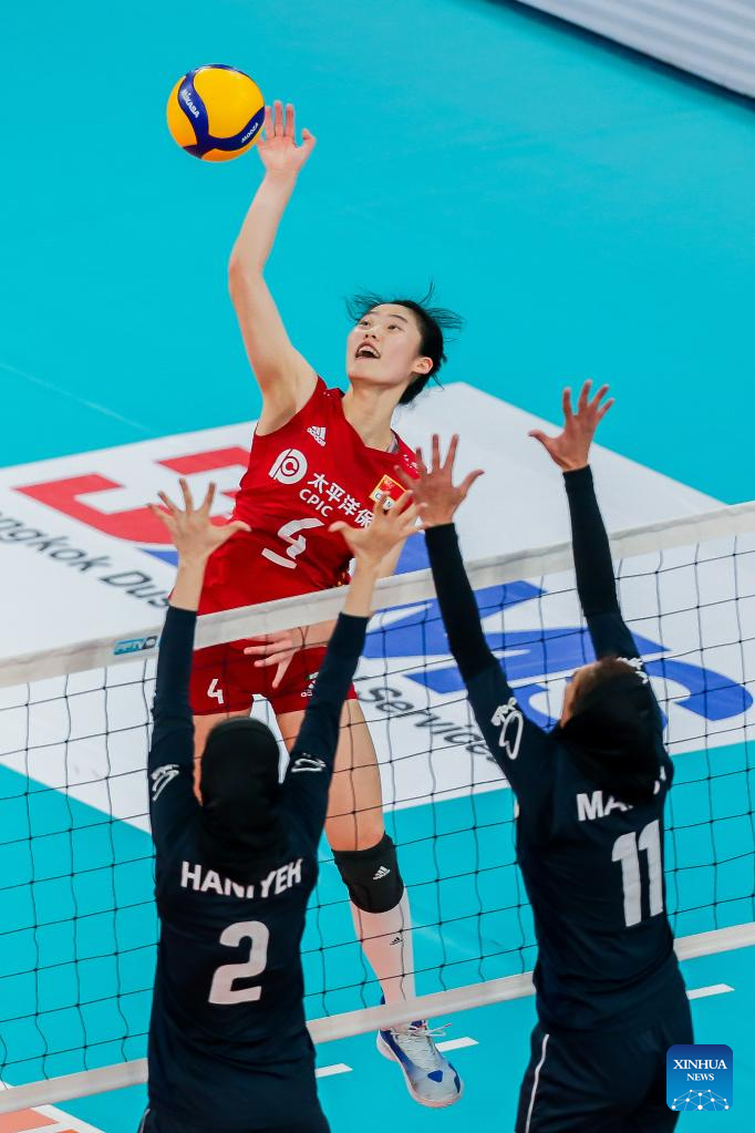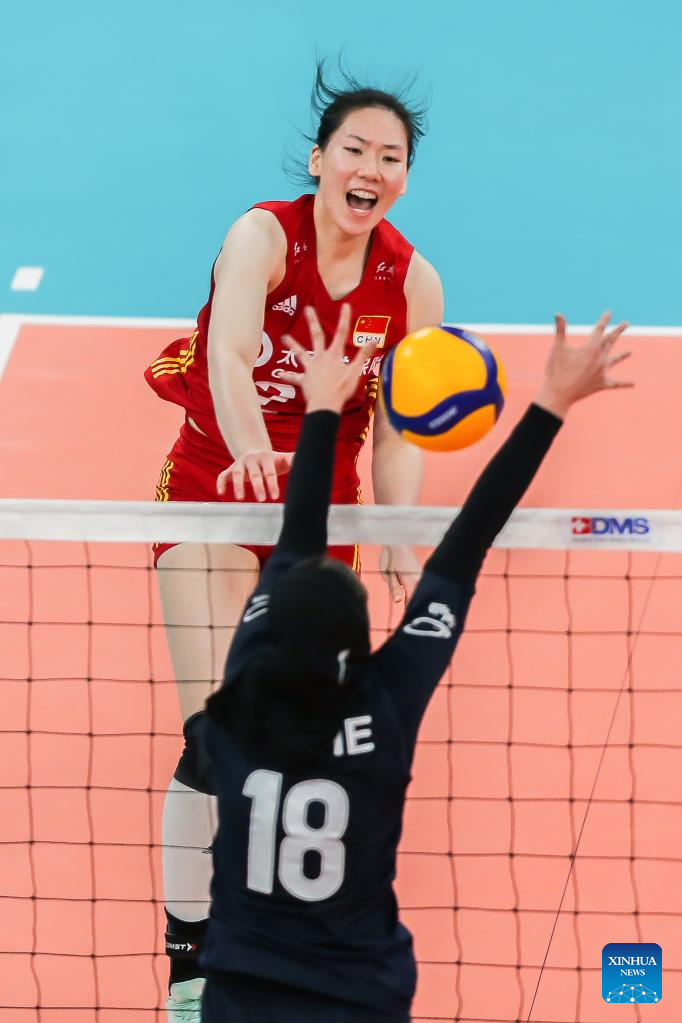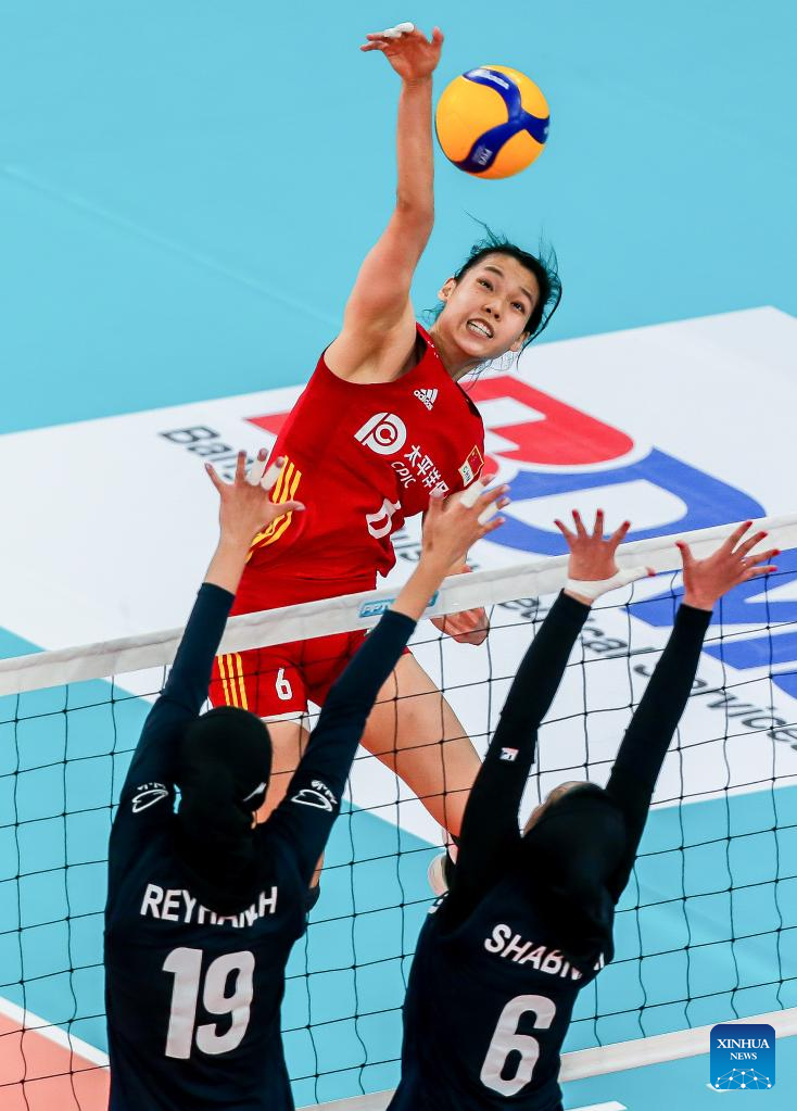 Wang Yifan (C) of China spikes during the preliminary round pool A match against Iran in the 2022 AVC Cup for Women at the Philsports Arena in Pasig City, the Philippines, Aug. 25, 2022. (Xinhua/Rouelle Umali)