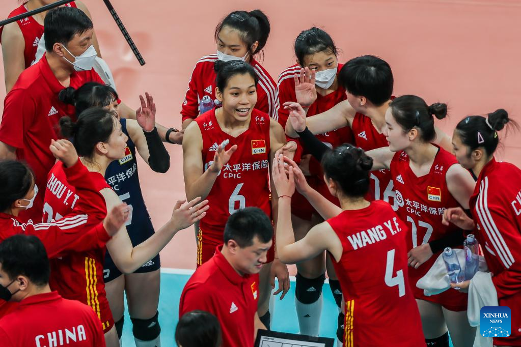 Players of China cheer each other during the preliminary round pool A match against Iran in the 2022 AVC Cup for Women at the Philsports Arena in Pasig City, the Philippines, Aug. 25, 2022. (Xinhua/Rouelle Umali)