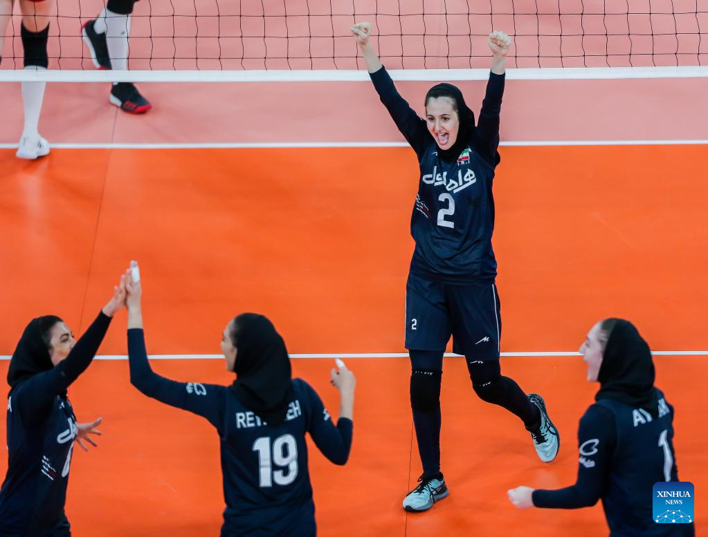 Players of Iran celebrate scoring during the preliminary round pool A match against China in the 2022 AVC Cup for Women at the Philsports Arena in Pasig City, the Philippines, Aug. 25, 2022. (Xinhua/Rouelle Umali)