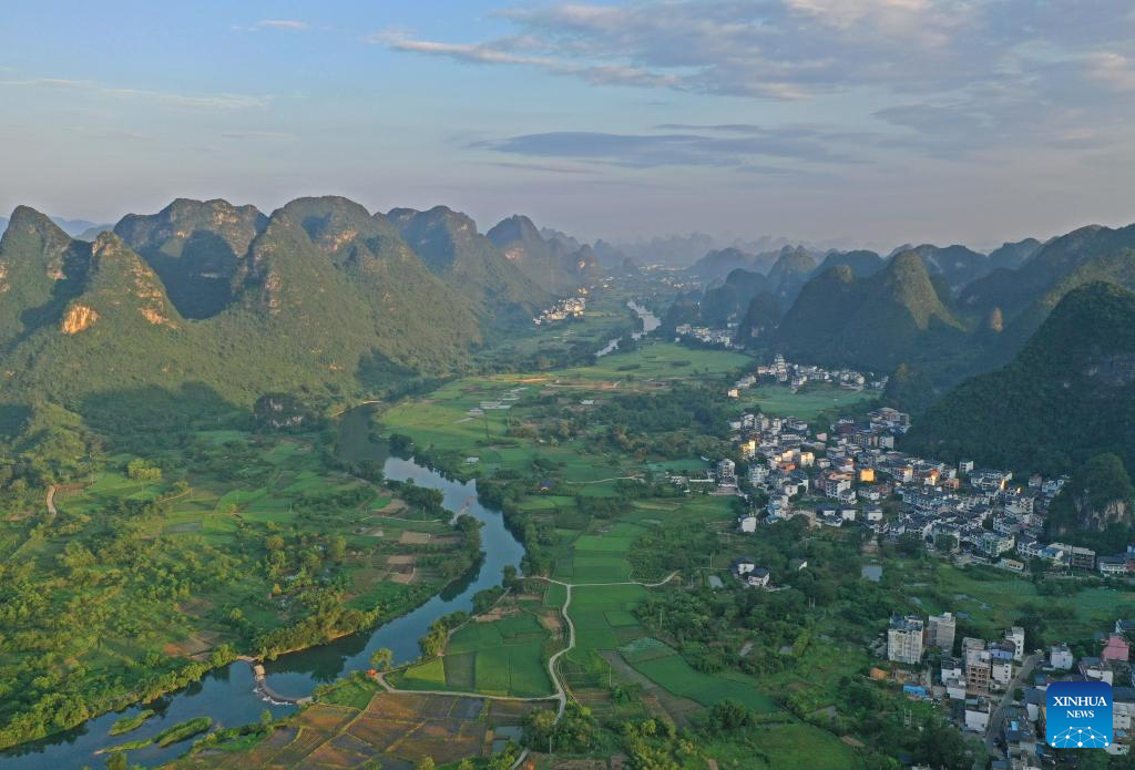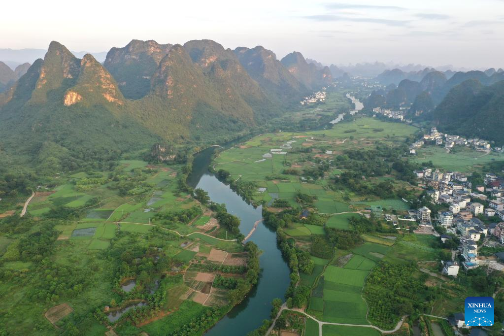 Aerial photo taken on Aug. 24, 2022 shows the scenery along Yulong River in Yangshuo County, Guilin City, south China's Guangxi Zhuang Autonomous Region. (Xinhua/Zhou Hua)