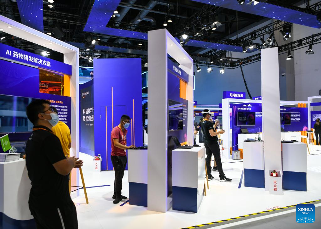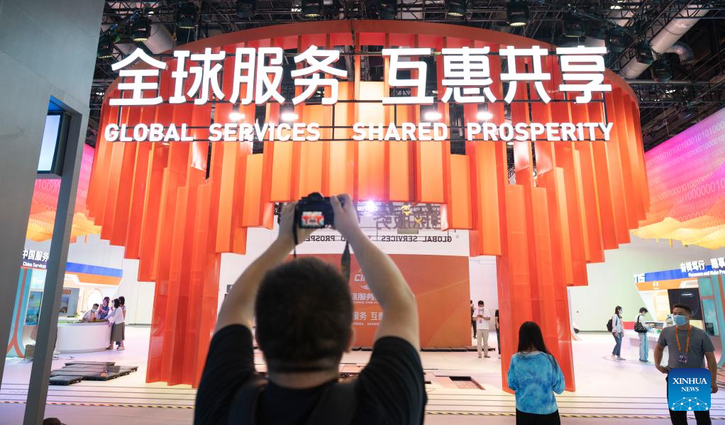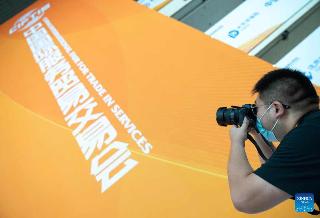 Photo taken on Aug. 28, 2022 shows a booth of the 2022 China International Fair for Trade in Services (CIFTIS) at the China National Convention Center in Beijing, capital of China. The 2022 CIFTIS will be held at the China National Convention Center and the Shougang Park in Beijing from Aug. 31 to Sept. 5. (Xinhua/Han Xu)