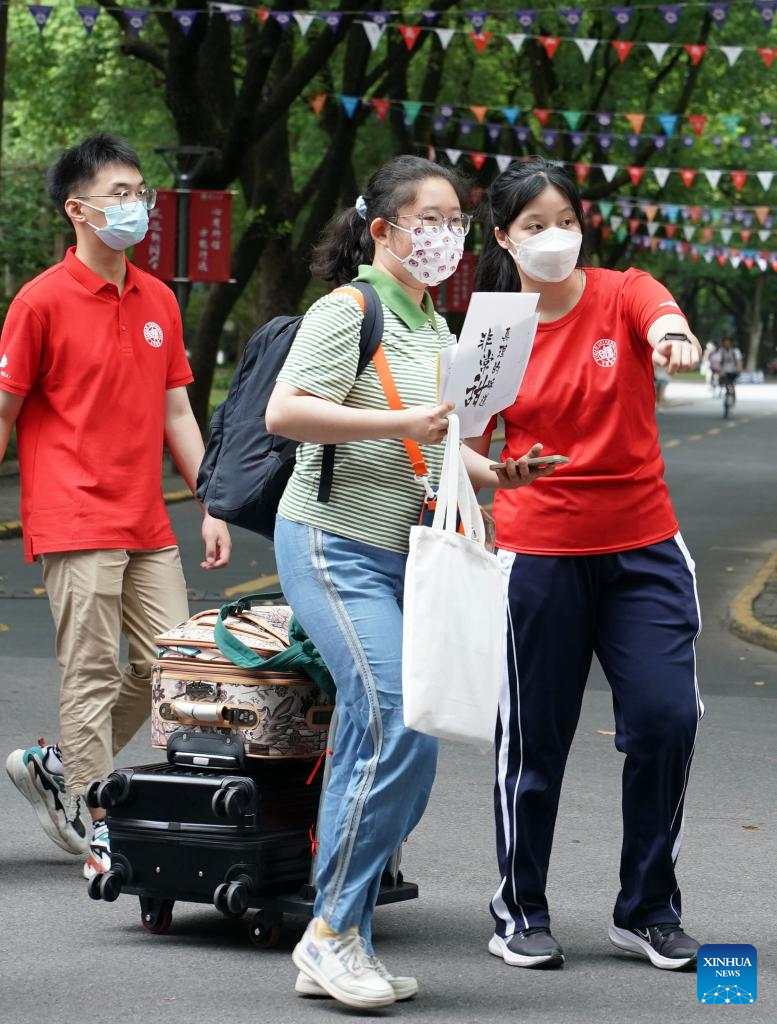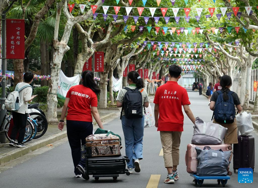 Volunteers help freshmen get to their dormitories at Fudan University in east China's Shanghai, Aug. 28, 2022. The registration of freshmen of the university started on Saturday. (Xinhua/Liu Ying)