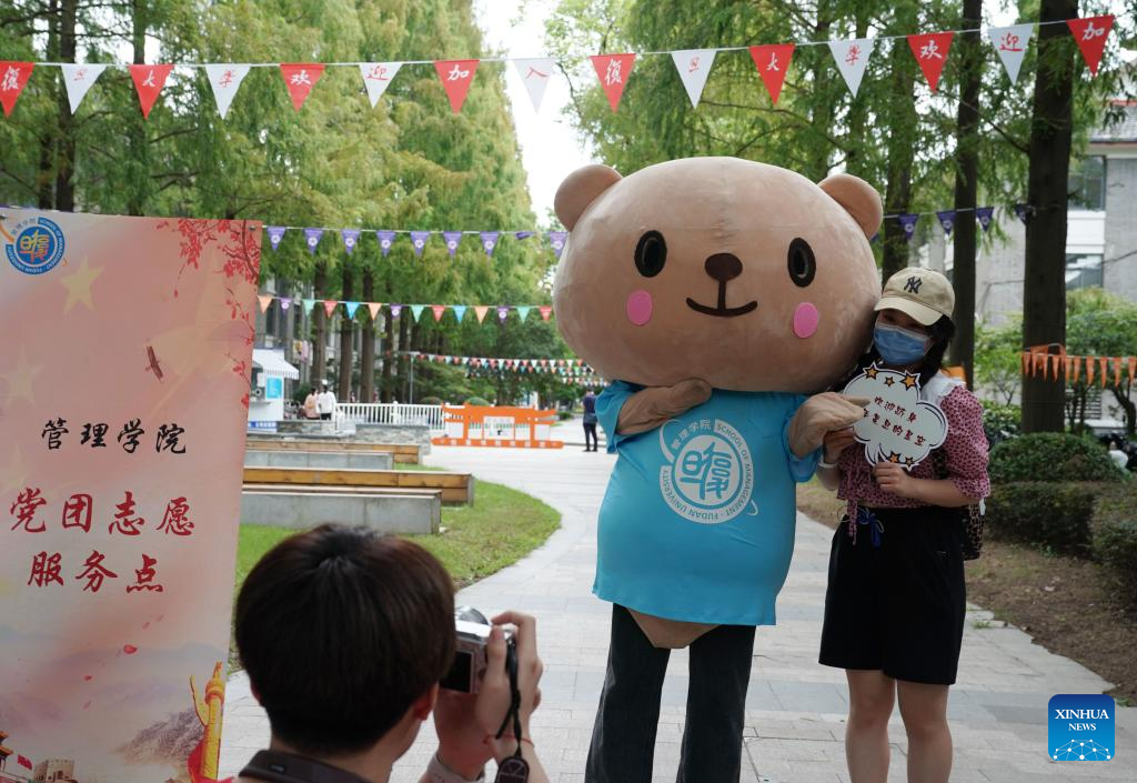 A freshman takes a photo with a mascot at Fudan University in east China's Shanghai, Aug. 28, 2022. The registration of freshmen of the university started on Saturday. (Xinhua/Liu Ying)