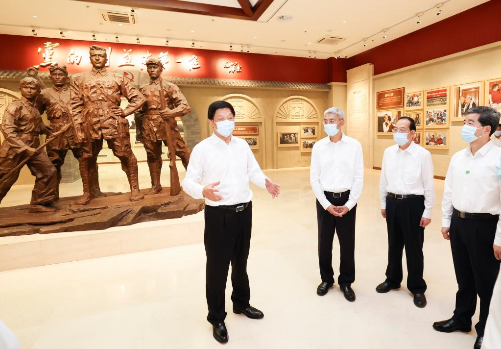 Li Zhanshu, a member of the Standing Committee of the Political Bureau of the Communist Party of China Central Committee and chairman of the National People's Congress (NPC) Standing Committee, visits a revolutionary memorial hall during his inspection tour to northwest China's Gansu Province, Aug. 26, 2022. Li has stressed protecting the Yellow River in accordance with the law, and using the river to benefit the people. (Xinhua/Pang Xinglei)
