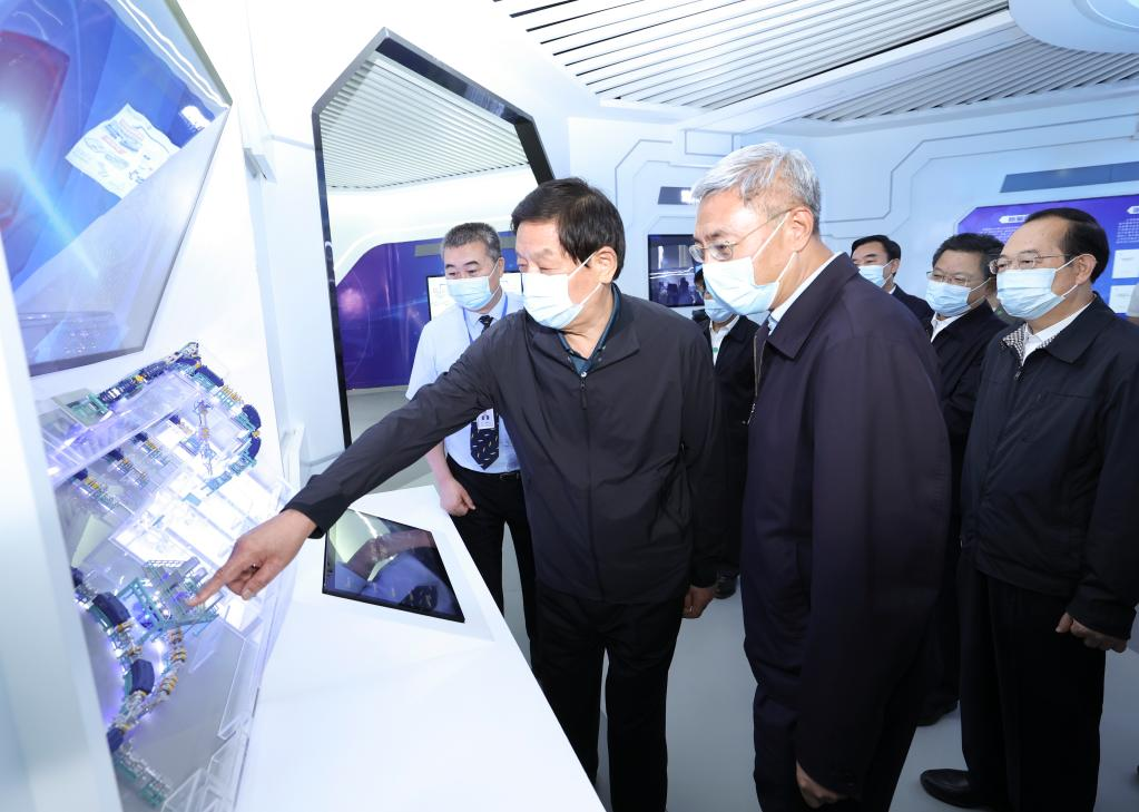Li Zhanshu, a member of the Standing Committee of the Political Bureau of the Communist Party of China Central Committee and chairman of the National People's Congress (NPC) Standing Committee, visits an equipment manufacturing base during his inspection tour to northwest China's Gansu Province, Aug. 27, 2022. Li has stressed protecting the Yellow River in accordance with the law, and using the river to benefit the people. (Xinhua/Pang Xinglei)