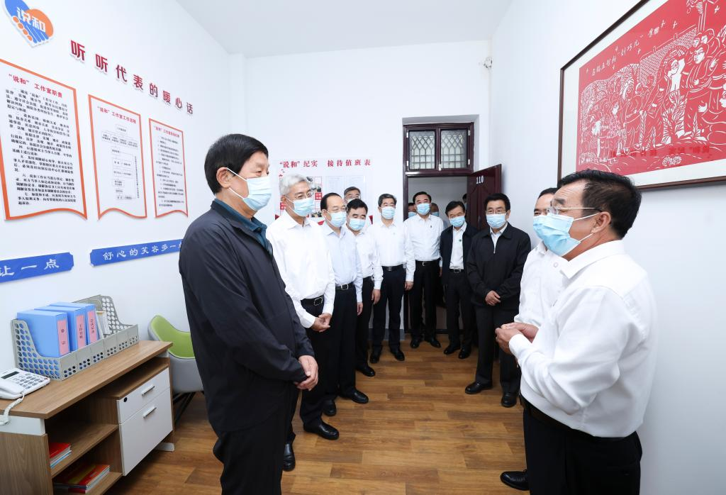 Li Zhanshu, a member of the Standing Committee of the Political Bureau of the Communist Party of China Central Committee and chairman of the National People's Congress (NPC) Standing Committee, visits Houguanzhai Town, Xifeng District of Qingyang City during his inspection tour in northwest China's Gansu Province, Aug. 26, 2022. Li has stressed protecting the Yellow River in accordance with the law, and using the river to benefit the people. (Xinhua/Pang Xinglei)