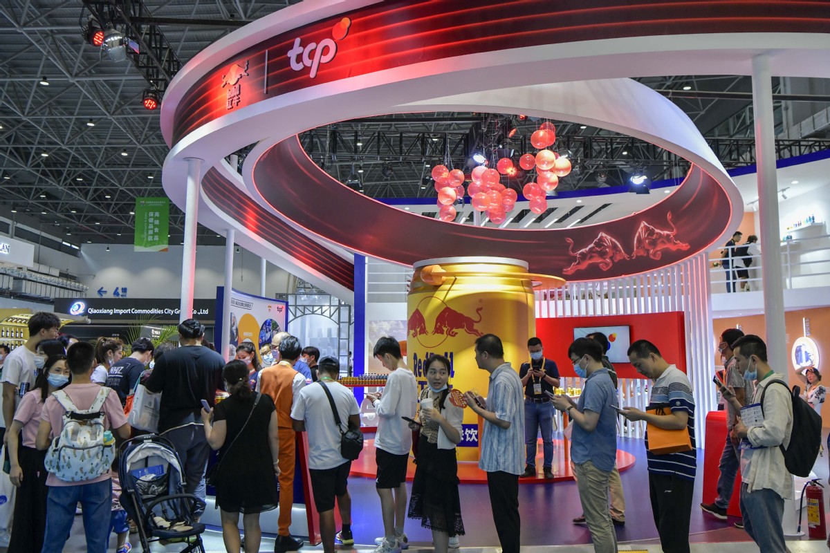 Visitors gather at the booth of Thai beverage company TCP Group during the first China International Consumer Products Expo held in Haikou, Hainan province, in May 2021. [Photo/CHINA NEWS SERVICE]