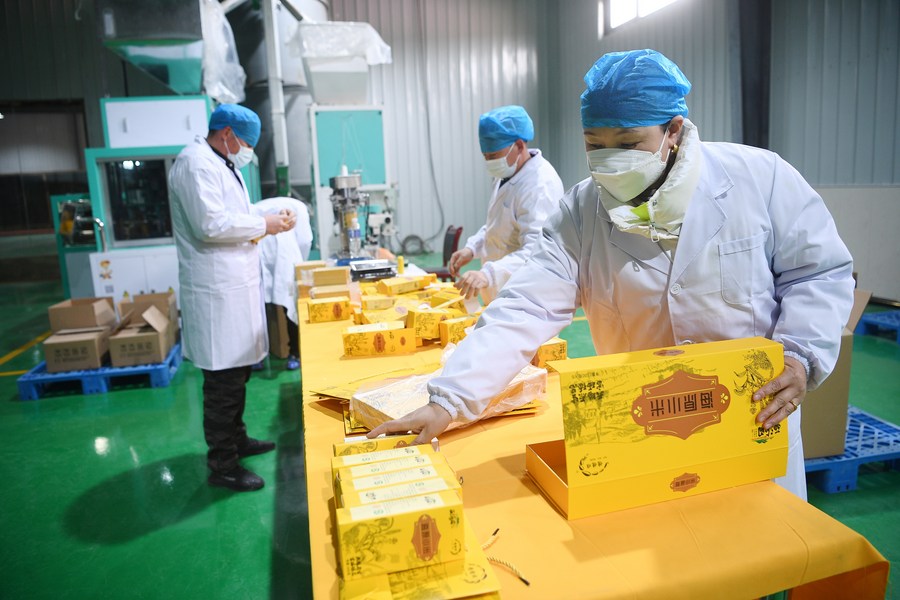 Workers package cereal products at an ecological agriculture company funded by Fujian Province, in Haiyuan County of Zhongwei, northwest China's Ningxia Hui Autonomous Region, Feb. 28, 2022. (Xinhua/Wang Peng)